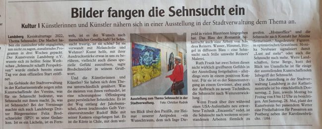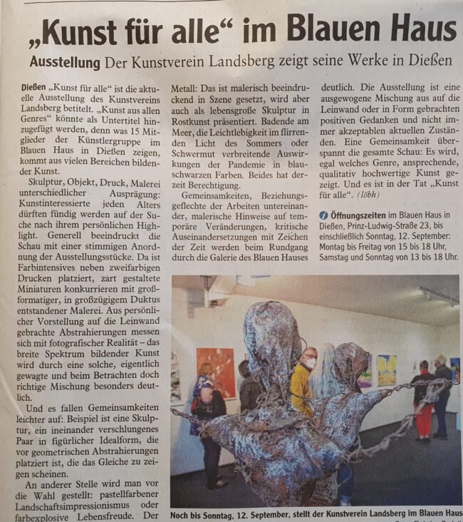 16 Künstlerinnen und Künstler des Kunstverein Landsberg e.V. präsentieren im Blauen Haus in Diessen vom 30. Juni bis 10. Juli, Malerei, Zeichnungen, Skulpturen und digitale Kunst. Benefizaktion: Zur Unterstützung geflüchteter Menschen aus der Ukraine bieten die Künstlerinnen und Künstler ausgesuchte Werke zu attraktiven Sonderpreisen. Der Erlös geht zu 100% zweckgebunden an die Flüchtlingshilfe Landsberg. Vernissage…