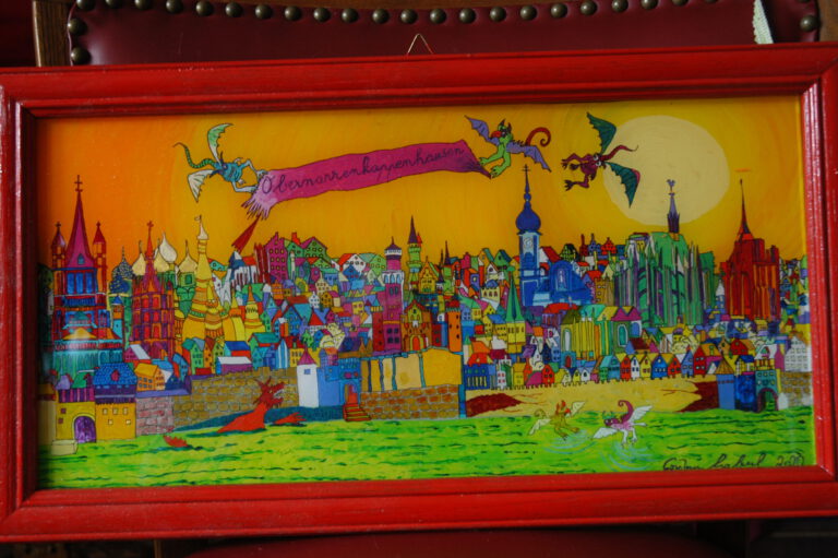 Und nun male ich seit bald einem halben Jahrhundert in der von mir so heißgeliebten Technik, denn faszinierend ist dabei nicht nur die Leuchtkraft der Farben, sondern eben auch die technische Vorgehensweise, nämlich „verkehrte Welt“.